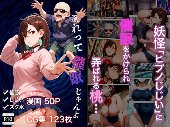 ダン●ダン綾●桃と妖怪じじいのフルカラー漫画+CG集です。 街で半透明のじじいを発見した桃。 不用意に声をかけてしまうが、催●術を使う妖怪「ヒプノじじい」だった! 漫画 フルカラー50ページ サイズ 1500×2188px (jpg、PDF同梱) CG集(漫画使用イラストの高解像度版) 123枚 サイズ例 1664×2432px、1536×1536…